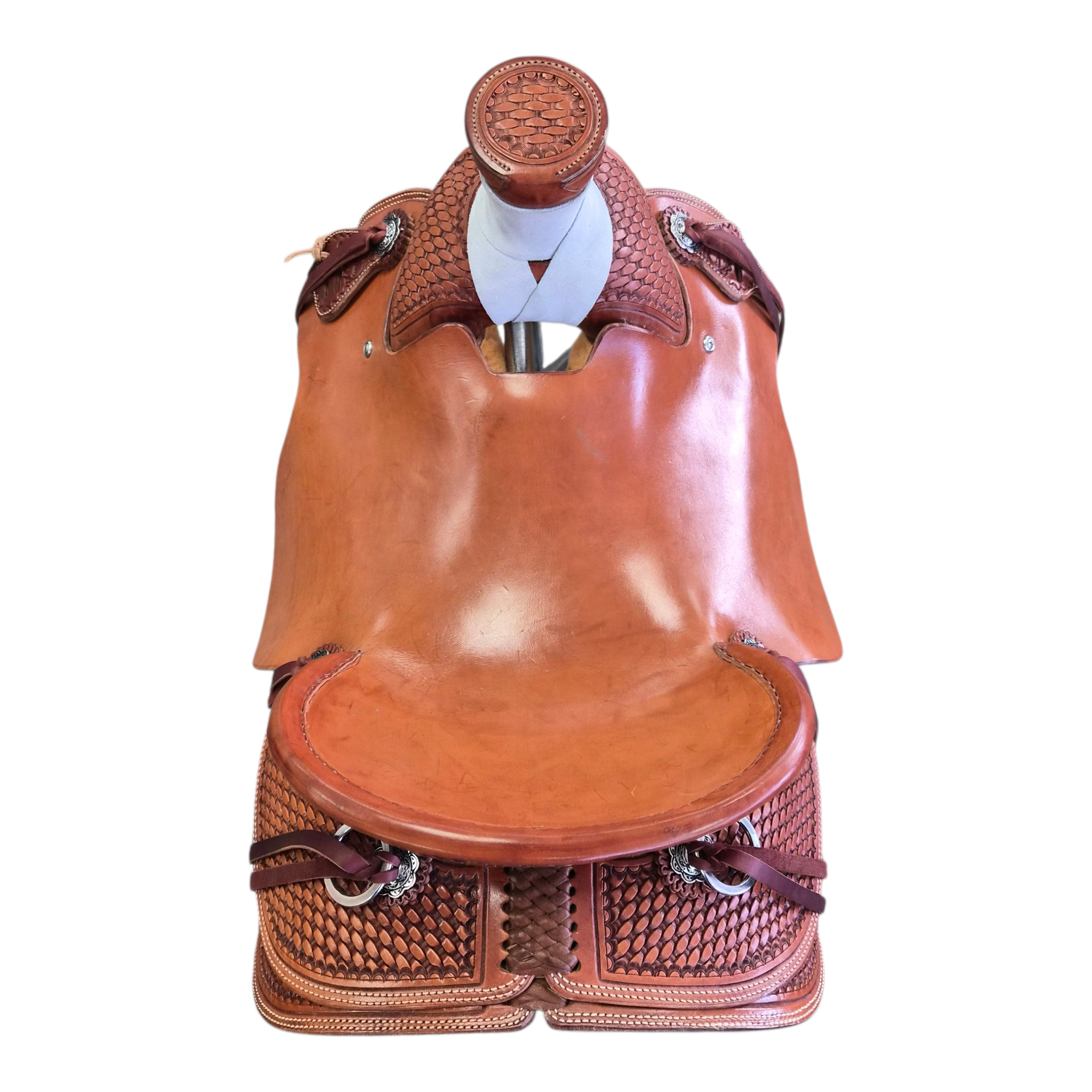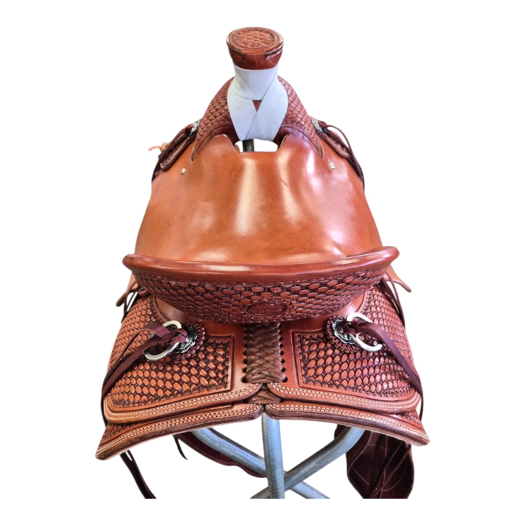 The Connolly Wade Saddle in chestnut is a true working cowboy’s saddle—crafted with purpose, precision, and pride. Featuring a hard seat for close contact and lasting durability, and 1/2 tooled large basket stamping for a clean, classic western look. The pencil roll adds a refined finish, while the flat plate mule wrap rigging ensures strength and versatility in the toughest conditions.